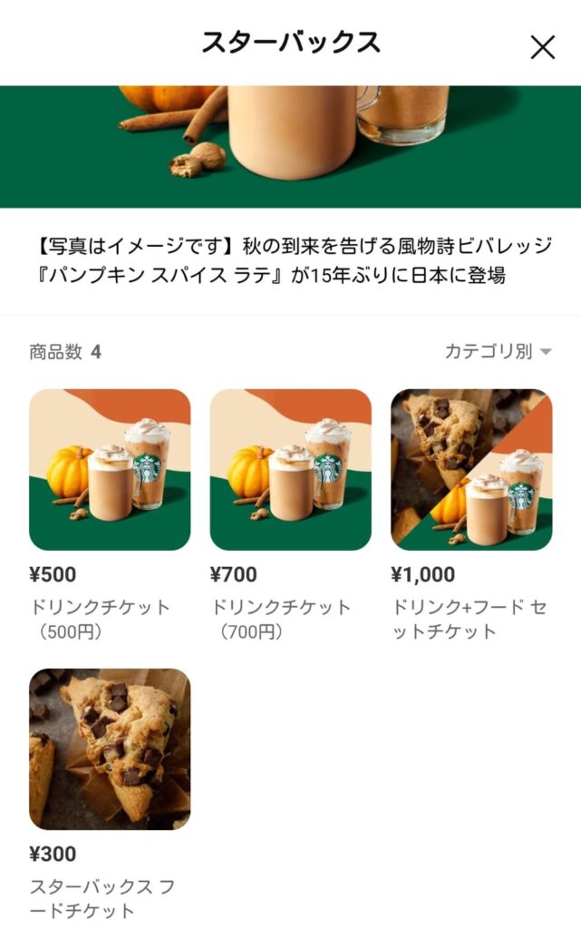 500円の場合は「ドリップコーヒー」「カフェミスト」「ラテ」など、700円の場合はフラペチーノ類や季節のおすすめも交換可能です。